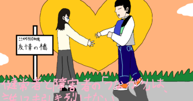 健常者の女性が知的障害の男性と握手し、共に二人三脚で友情の橋を渡ろうとする。例え何があろうと、健常者と障害者の「つなが...