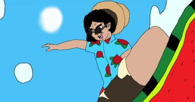 スイカの柄のサーフボードに乗って、サーフィンを楽しむ男性。まさに夏の終盤を楽しんでいるところだ。 暑中見舞い申し...