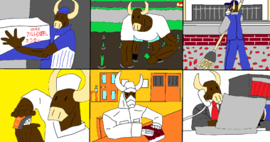 様々な職業にチャレンジ精神で取り組む牛。寿司屋、オフィス、引越センター、就労移行支援事業所など、ありとあらゆる職場で牛...