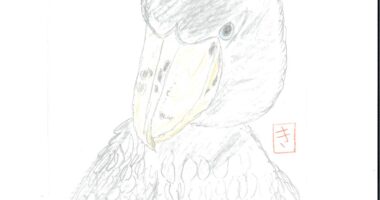クレヨンで描いた二体のハシビロコウの横顔です。 水彩色鉛筆で描いたハシビロコウと若葉です...