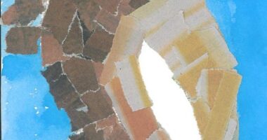 新聞の色の部分をちぎって絵にしました。木目調のハシビロコウに仕上がりました。 ブルーの背...