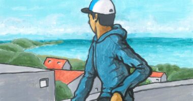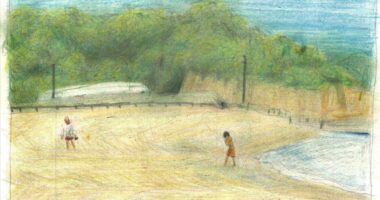 去年、東松島の月浜海水浴場に行った際の、一コマを描きました。 9月なのに、水着で海に入っていて印象的でし...