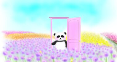 お花畑とパンダ暖かい春が待ち遠しいので、お花畑にいるパンダを描きました。 加美町にある『やくらいガーデン』のお写真を参...