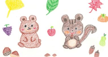 少しずつ、涼しくなってきましたね♬ 秋をテーマに、くまとリスを描きました♪ 周りにはくだも...
