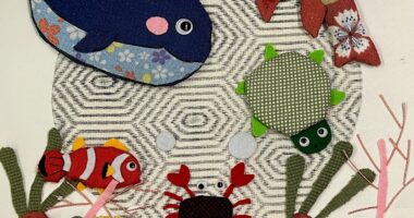今回はクジラ、イルカ、カメ、カニ、クマノミ(ニモ)と石や海藻で表現してみました。海藻にイソギンチャクをラメ入りピンク色...
