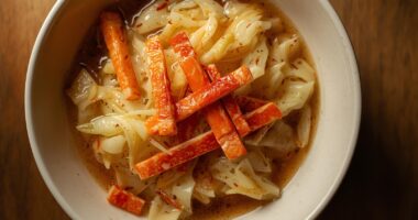 フライパンに材料を入れ、ふたをして煮るだけ!トロトロに甘~く煮えた白菜にカニカマの旨味がしみ込みいくらでも食べられそう...