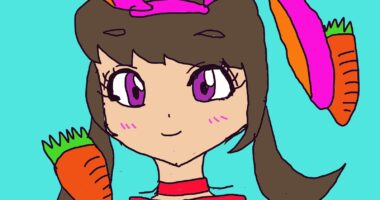 うさぎの女の子を書きました。うさぎっぽさを出すため、人参も描きました。ピンクの耳に背景は水色にしました。女の子...