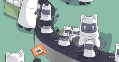 今回は、ロボット工場のイラストを描きました。 ロボットおもちゃを作る猫ロボットたちと、その様子を見学する...