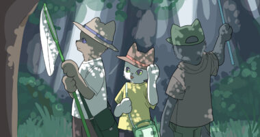 今回は森に虫とりに来た猫の子供たちのイラストを描きました。 影の色はいつもは青色なのですが、森の中にいる...