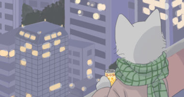 今回は、室内の展望台から夜景を眺める猫のイラストを描きました。 大変だったのがビルです。 ビルは写...