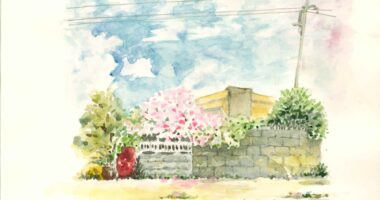 スモークツリーの咲く家(水彩画)