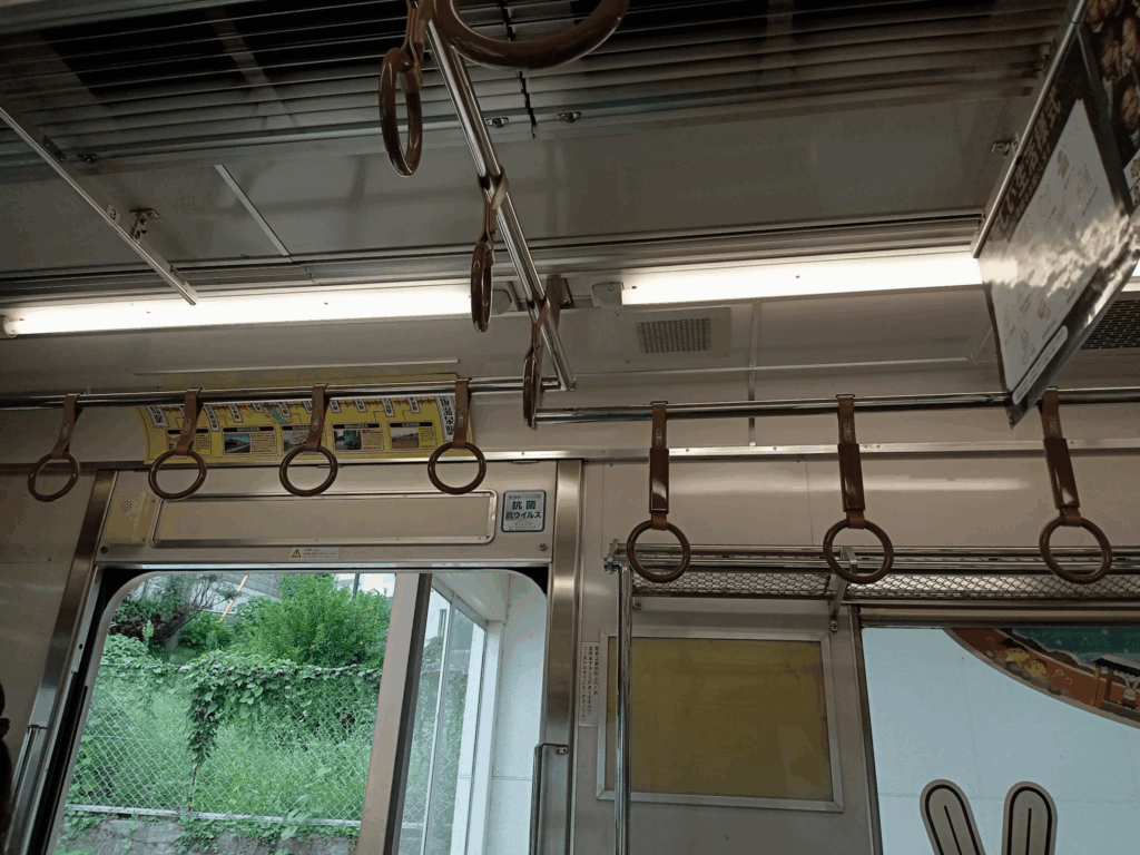 丸い吊革が特徴。