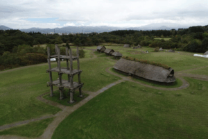三内丸山遺跡:青森市郊外にある、縄文時代の拠点集落の遺跡です。出土品も豊富だが、その中には北海道の黒曜石、新潟県の翡翠、岩手県久慈の琥珀などが見つかっており、当時の北方地域のモノと交流を如実に物語っています。
