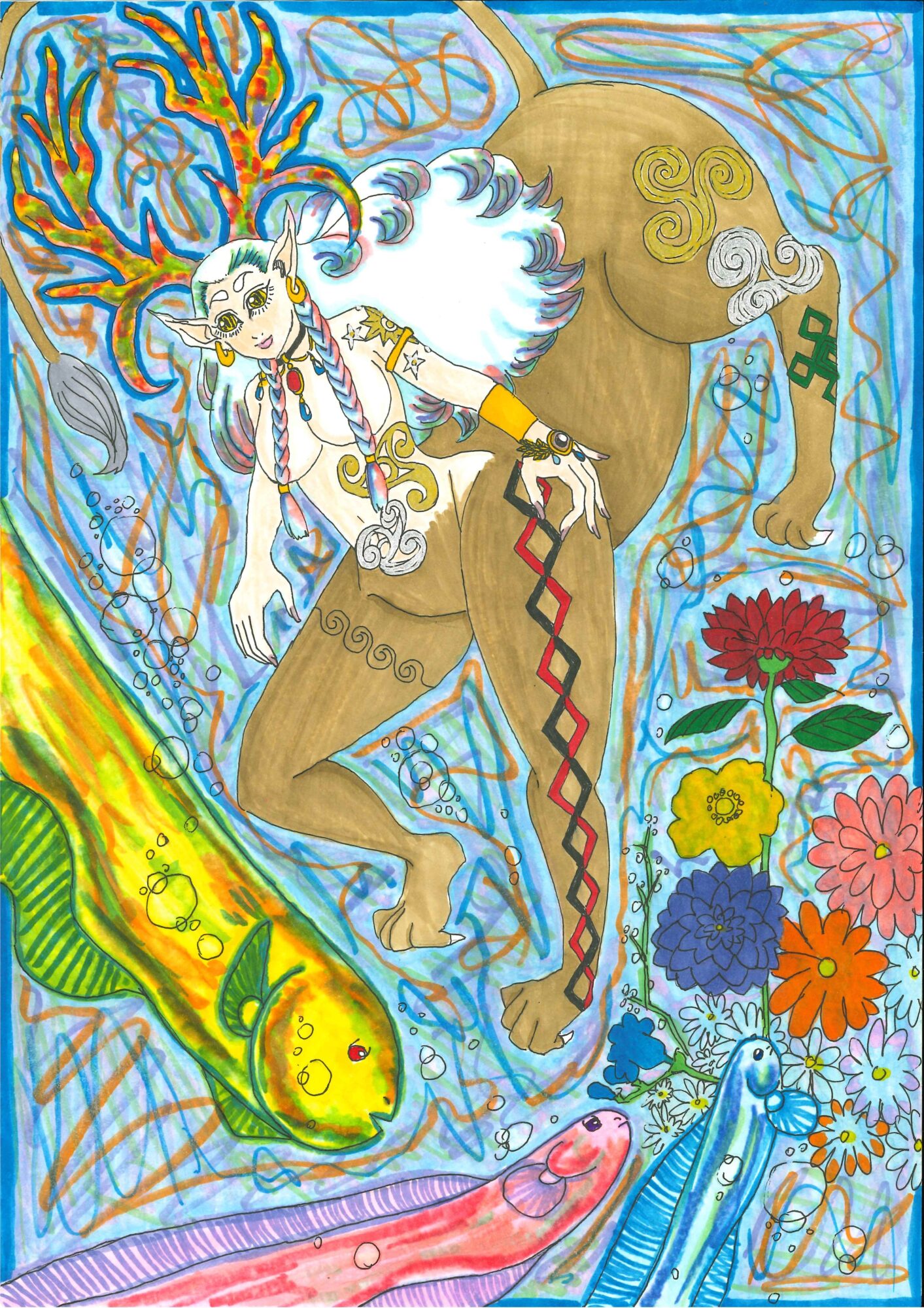 一安心です。 ちなみに、このキメラ女子は、「ダンジョン飯」とゆう漫画、アニメであるキャラクターが、キメラ化してしまうとゆう、のを、アニメ雑誌で、読みまして、脳内で、激しいインスピレーションが、溢れてしまったので、 自分なりに、自分だけのキメラ女子を描きたいと、思い至り、昨年一応紙に描きました。