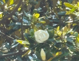 Fresh water flowing down from blossom to tree bark; the grandeur of a magnolia tree.