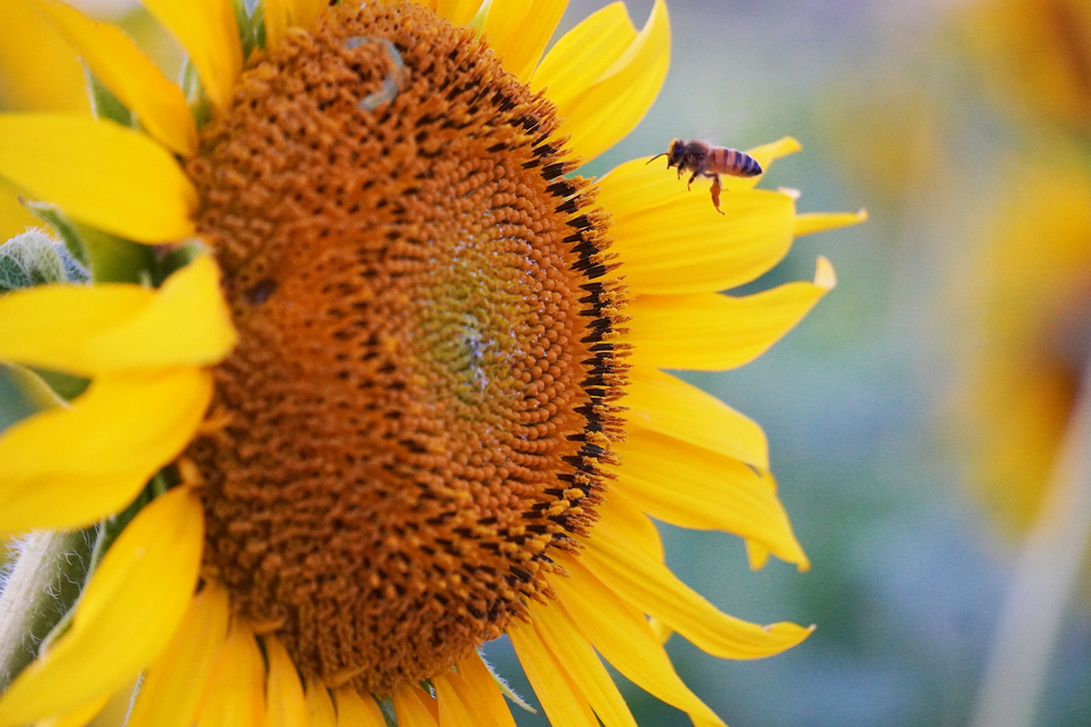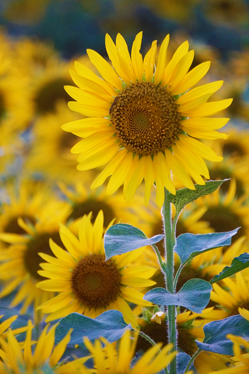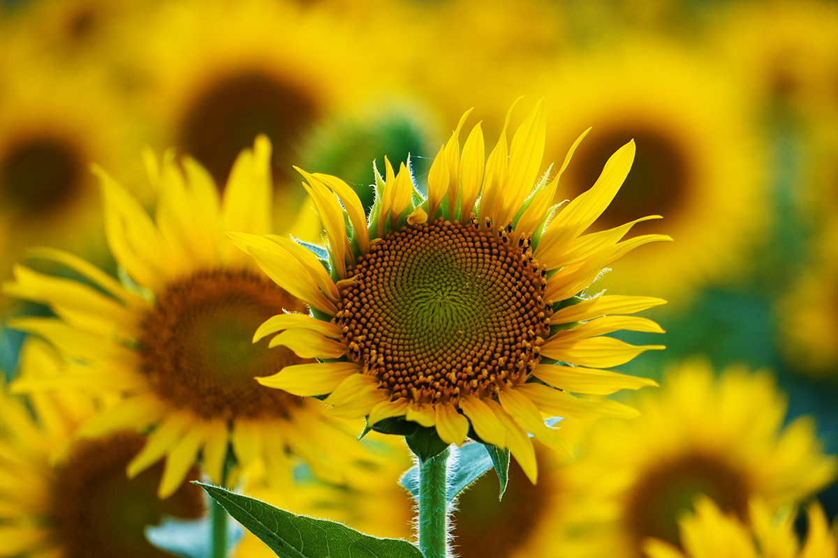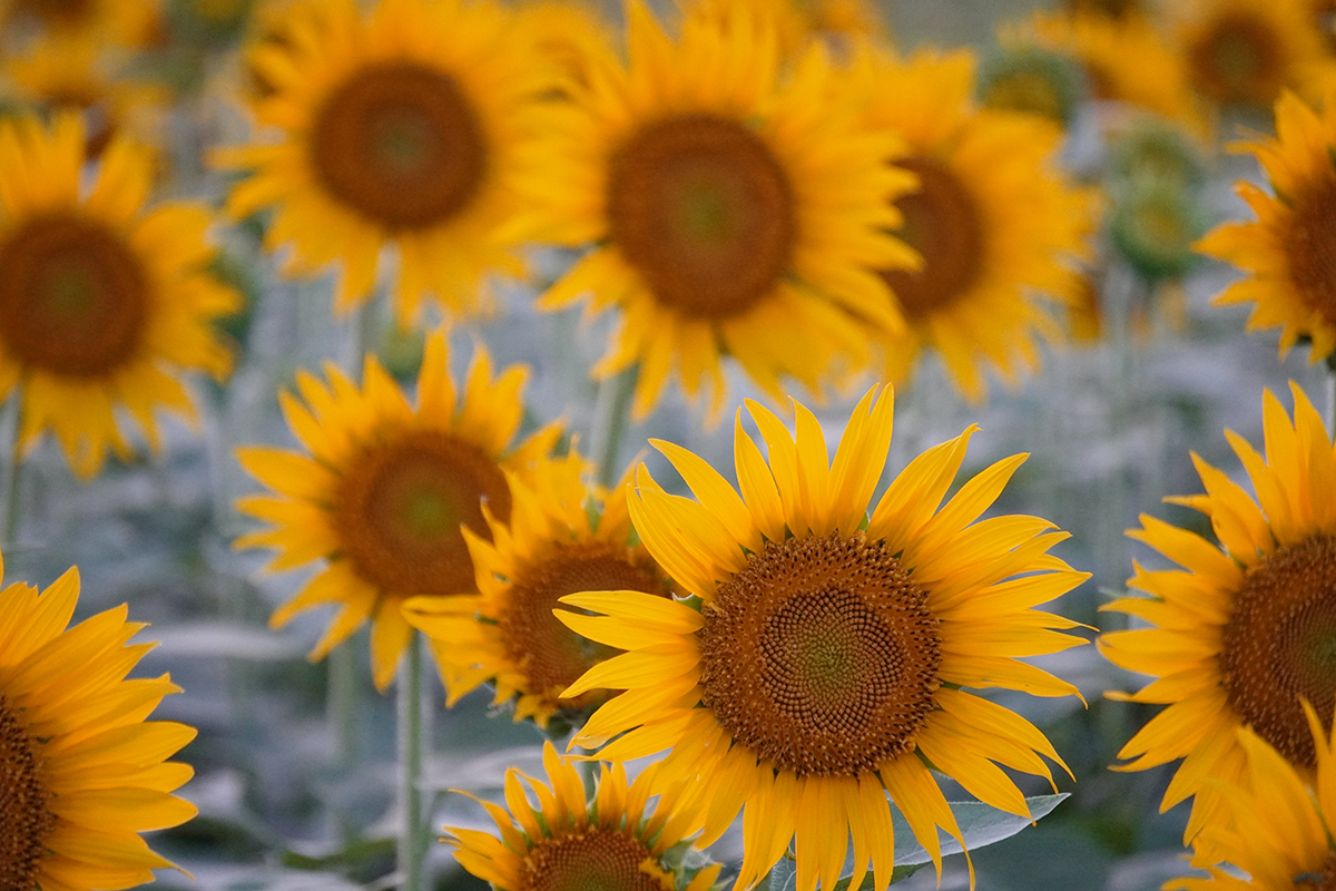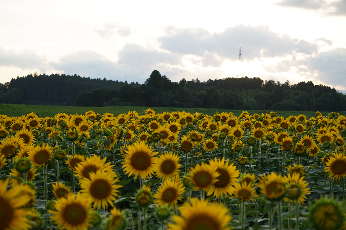 今年5月に撮影したクリムゾンクローバー畑と同じ場所で、8月にはひまわりを見ることができました。