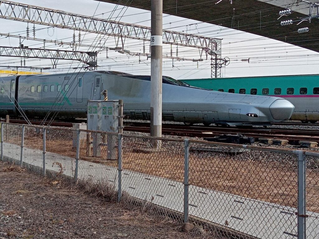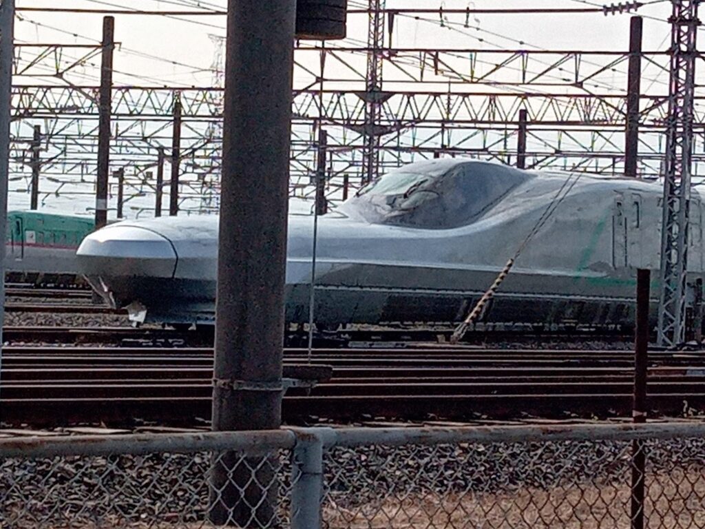 試験車両アルファエックスと東北新幹線はやぶさの並走