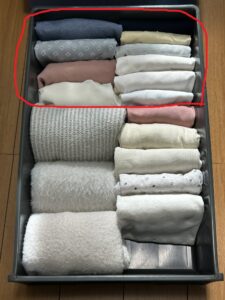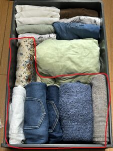 ⇚現在のボトムスの収納です。赤枠が現在のオンシーズン服です。ボトムスは横並びに出来なかったので縦向きに並べてます。トップスよりも数を減らすことが出来たので余ったスペースにスーツ用のシャツ、オフシーズンのモノと替えの布団カバーを入れています。まだスペースに余裕があるので他に仕舞えるモノがないか試したり、仕切りで区切って使いやすくするか検討中です。