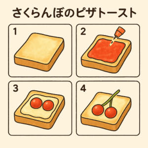 特に簡単なのはさくらんぼ!プチトマトを半分に切って、カットしたピーマンを乗せてトースターに入れるだけ!
