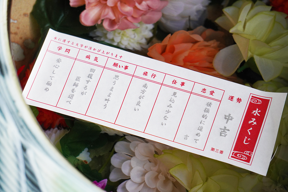 お店で水みくじが販売されていたので、記念に引いてきました。水に入れると文字が浮かび上がってきます。