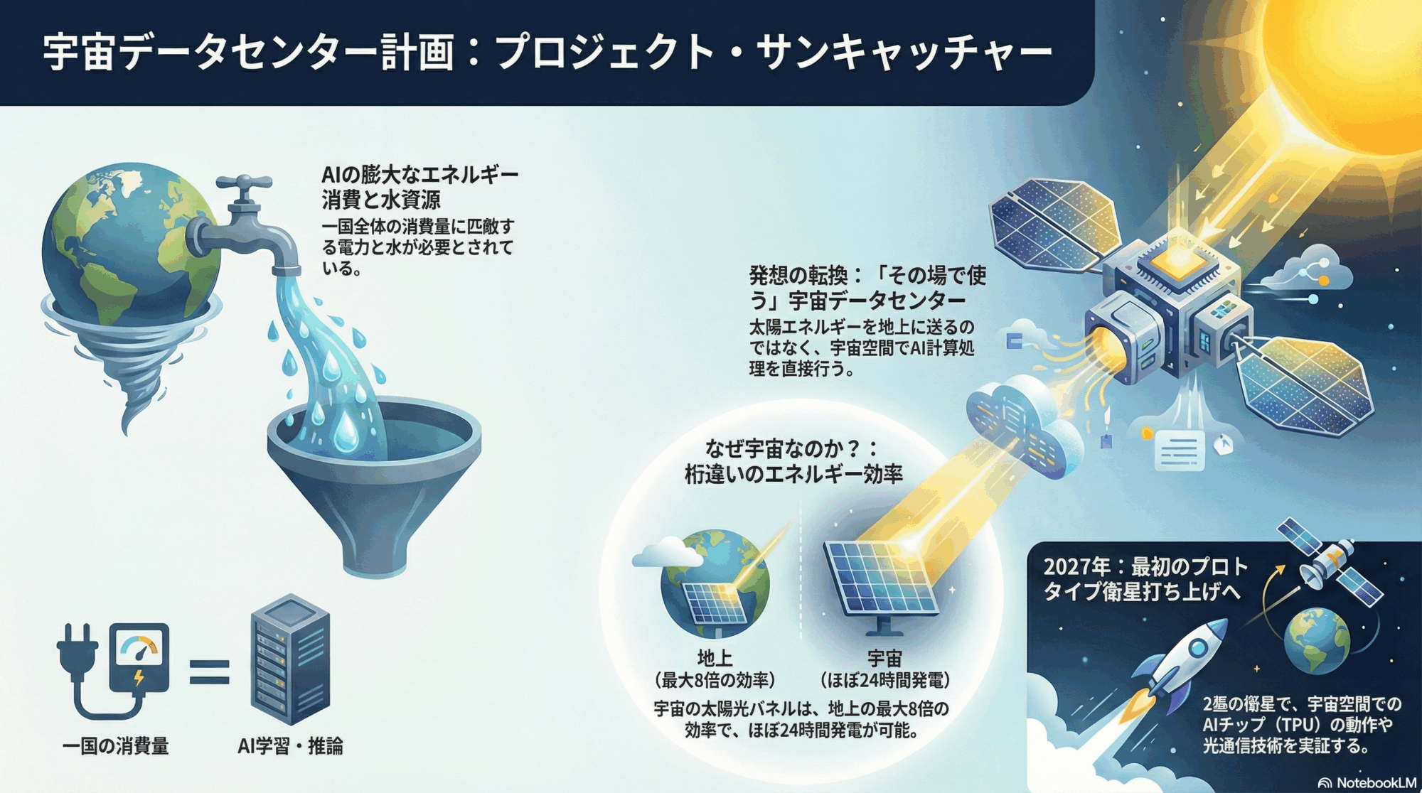 それが、宇宙空間にAIインフラを構築するムーンショット(野心的な挑戦)、プロジェクト・サンキャッチャー(Project Suncatcher)である。