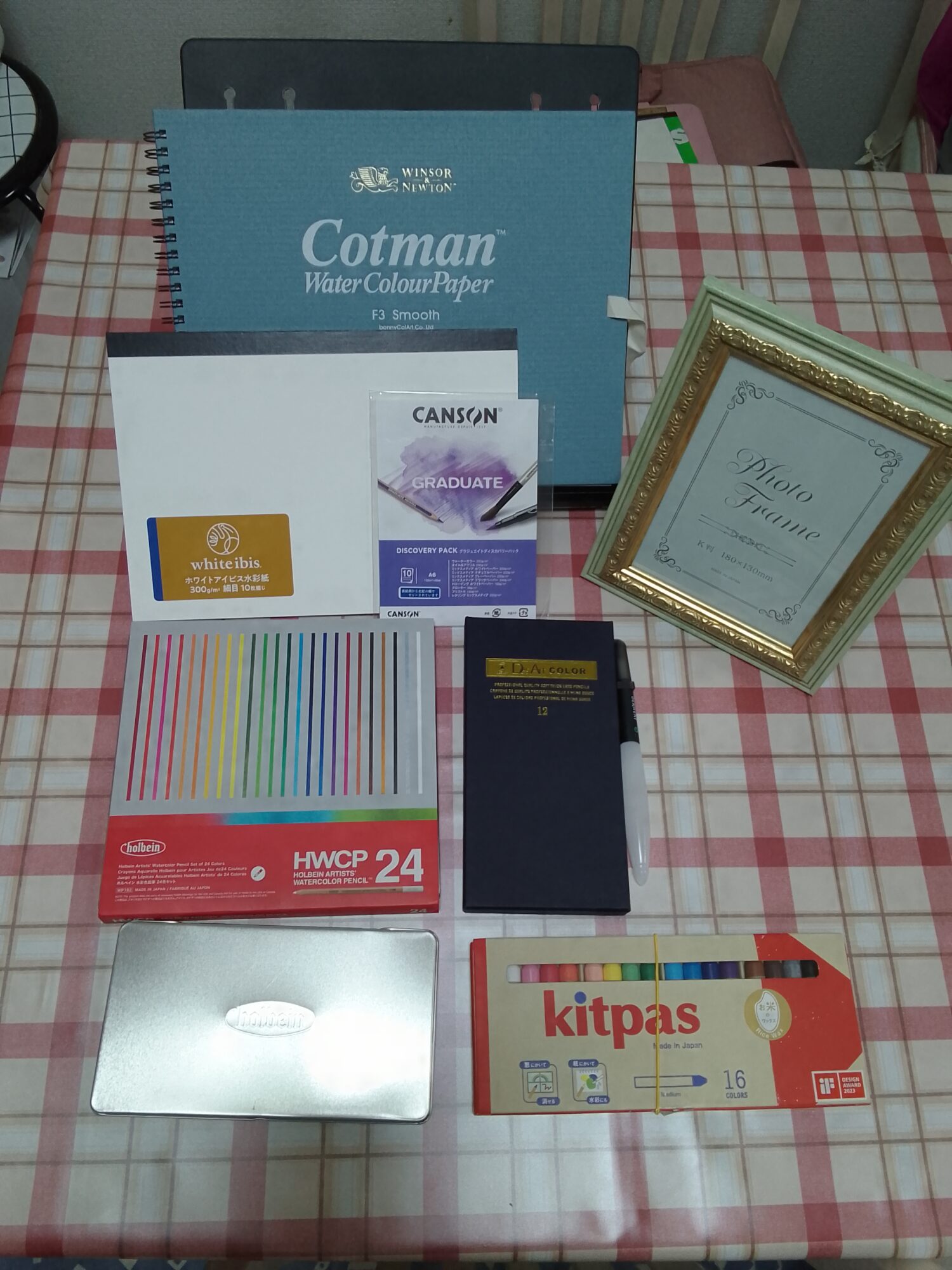 この二つ以外にも使用して大好きなキットパスというクレヨンや少し高めな水彩紙やオシャレな額縁、水筆、ケース、ハガキサイズの塗り絵などが入っていました。