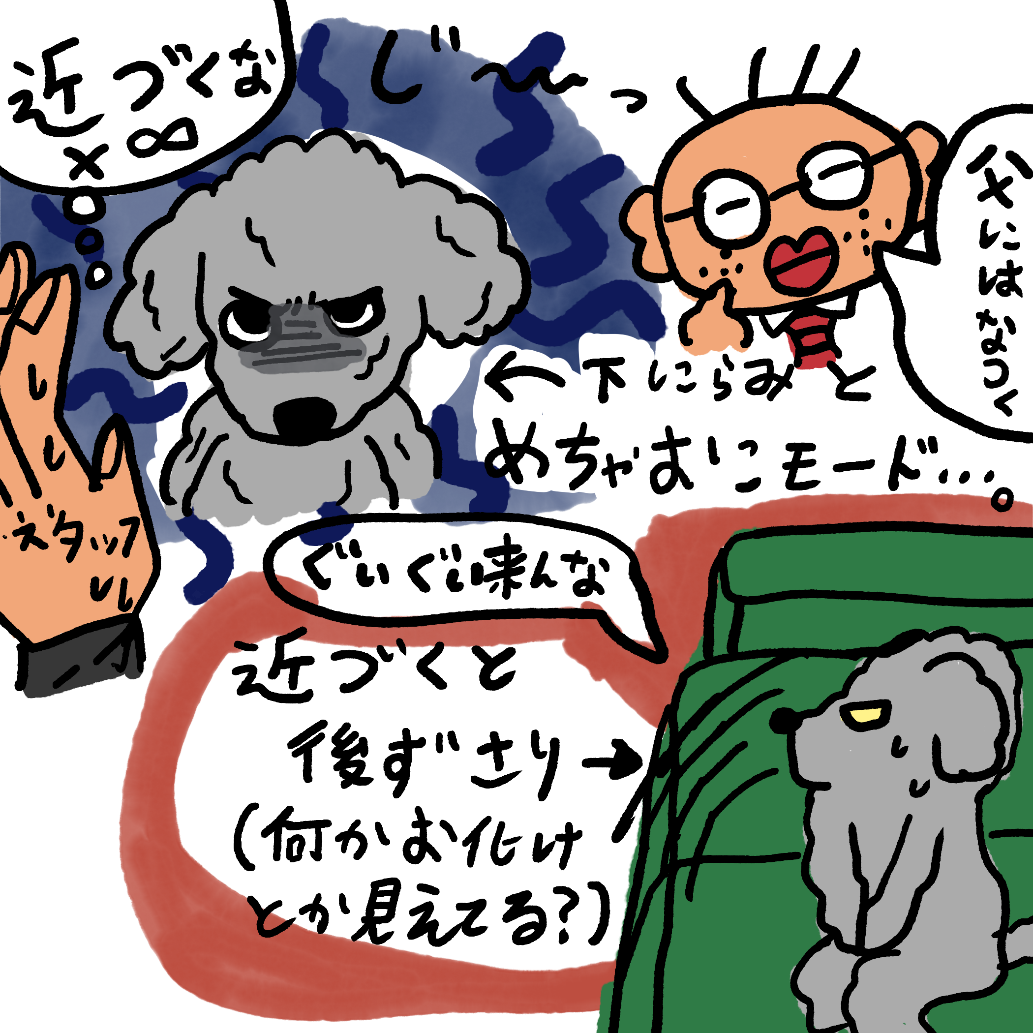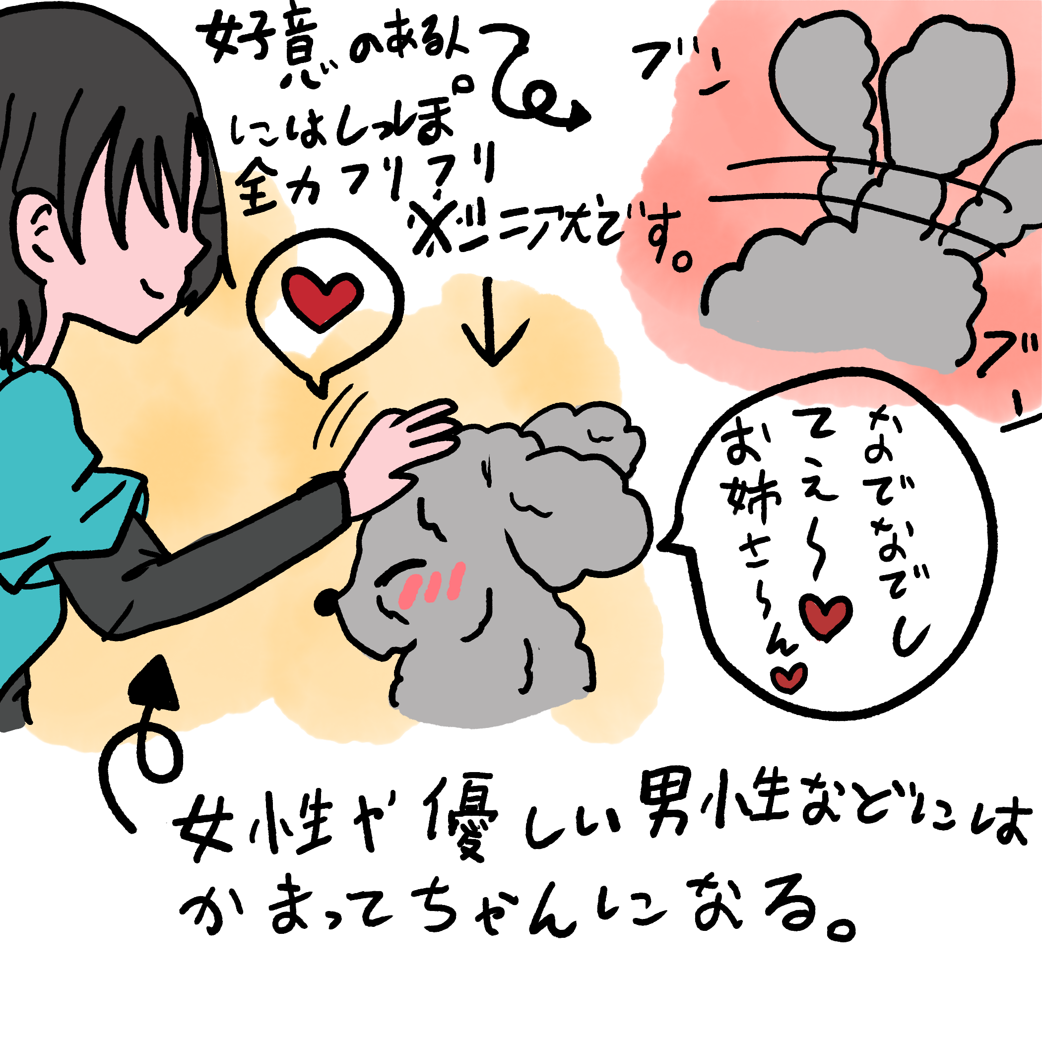 ・・・ですが、銀太は人見知り傾向で警戒心が強いため、まるで番犬のように訪ねてきた人にめちゃくちゃ吠えます。それでも親しい人や優しい人に懐きます。いつもの銀太は下の絵のとおりです。