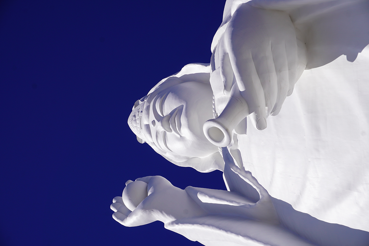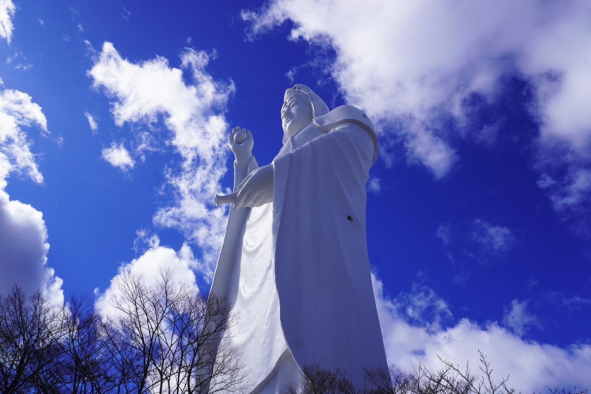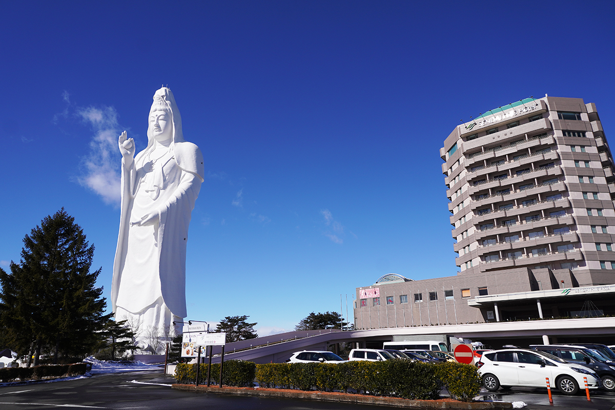 正式名称は「仙台天道白衣大観音」と言います。その大きさは全長100m、日本で2番目に大きい仏像で、観音像では日本一の大きさです。あのニューヨークの自由の女神像よりも少し大きいんです。