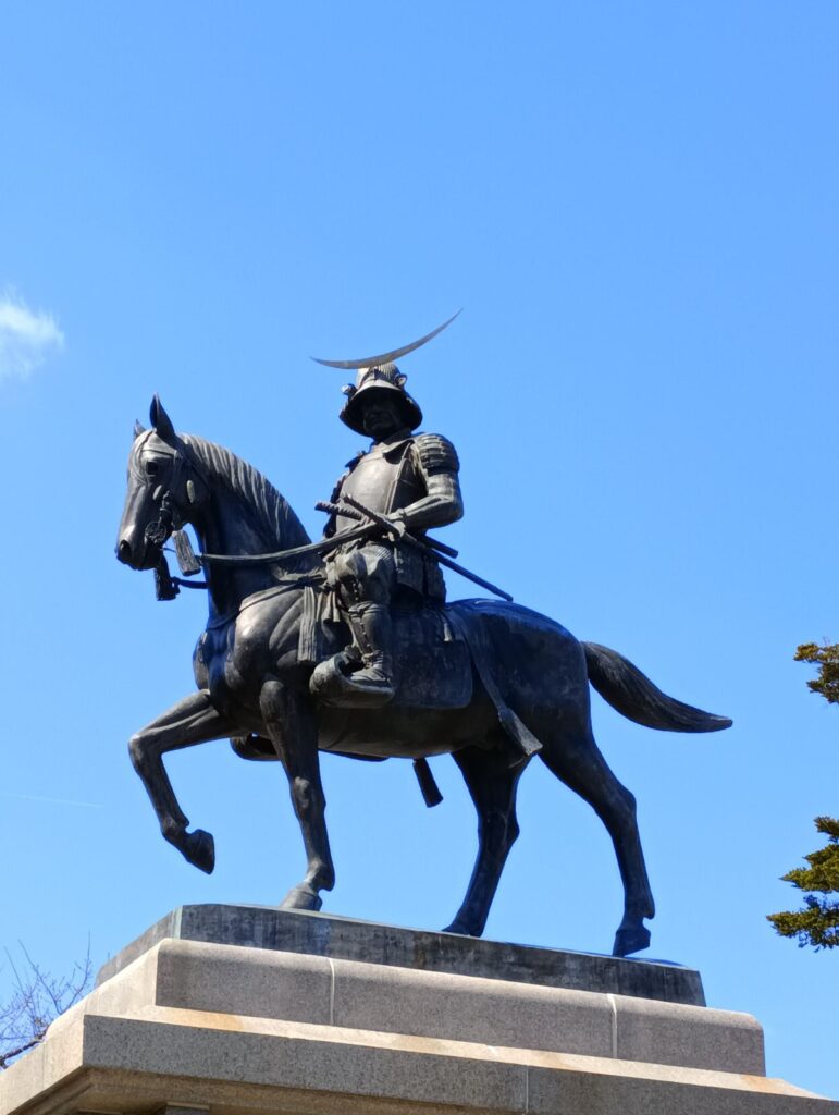 仙台城に到着。有名な伊達政宗像です。この日は快晴で青空がきれい。
