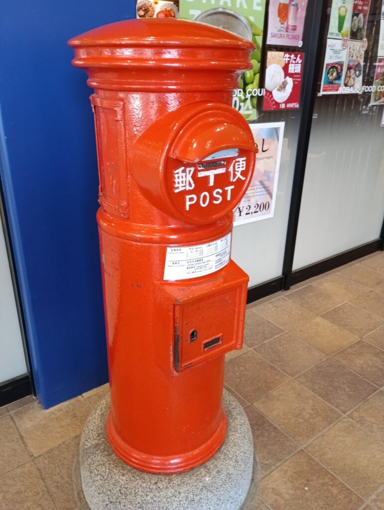 お目当ての仙台城のお店にある丸形ポスト。昭和の時代ではお馴染みの丸形ポスト。