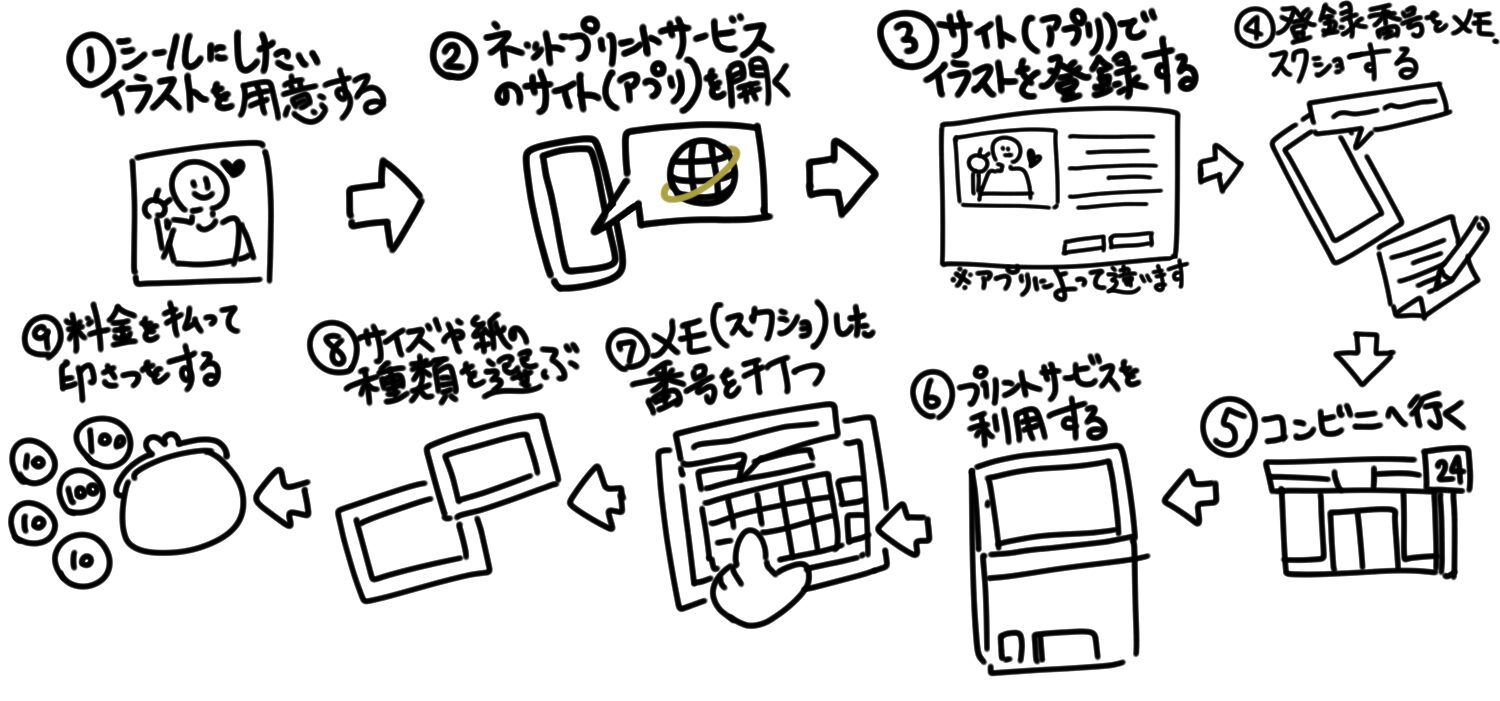 まず、シール(など)印刷したいイラストや写真を用意してください!写真にデコや落書きをしたい場合は写真加工アプリで描いておきましょう!