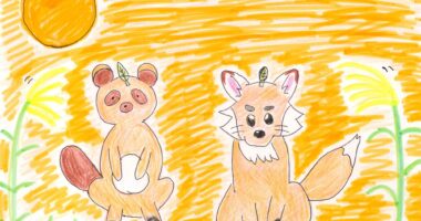 夕日の中、タヌキとキツネが葉っぱに乗せている姿が可愛いですね。 キツネの絵を書く時に特徴をとらえるのが難しかった...