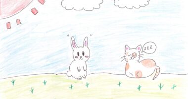 青空の中、太陽の日差しの中、猫が草原で昼寝をしている所が可愛くて癒されます。😊 うさぎち...
