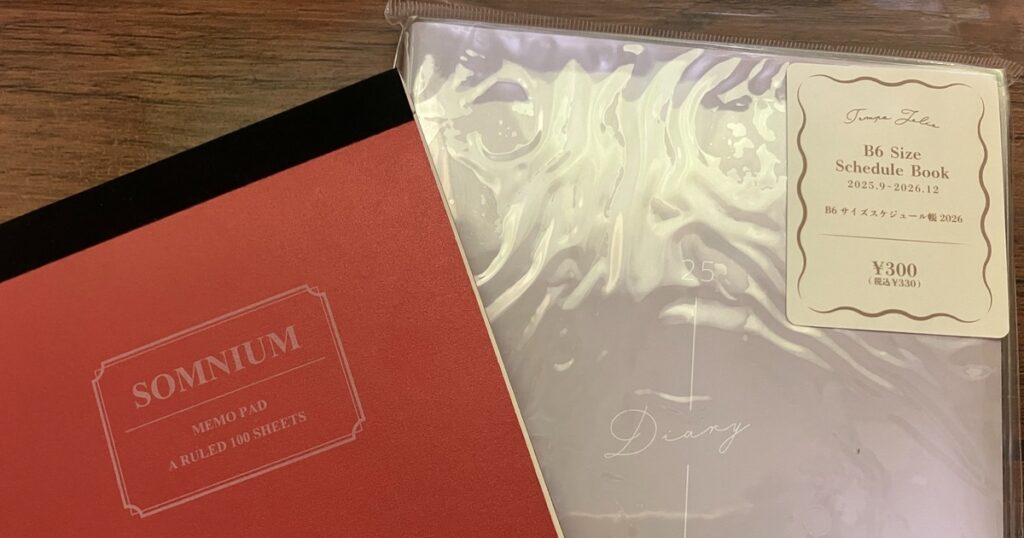 今月の半ばまで使っていた無印良品のフリーのマンスリーノートをうっかり途中から日付を間違って記入していたため、手帳類が必要になった。偶然入った3COINSに330円のウィークリー欄がある手帳が売られていた。数秒だけ迷い購入。帰宅後、DAISOのコピー機で写真印刷した自分の絵を表紙に挟んで来月に備え少しだけ記入。ファンアートのため、写真にあるものは開封前に撮影。色は推しの概念をイメージして選びました、とだけ。
