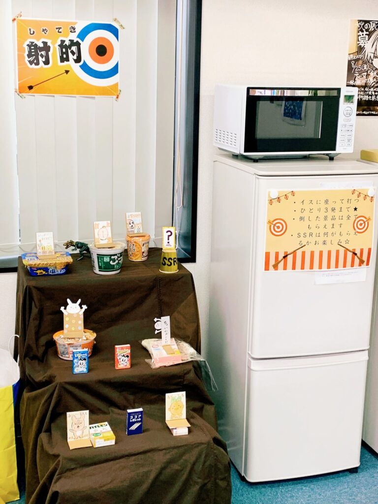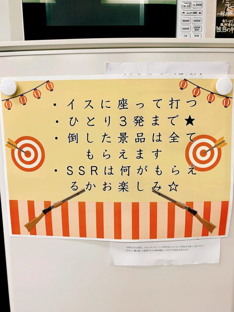 一人3発ずつ挑戦できるのですが、これが意外と距離があって難しかったです。外すたびに狙いを修正してなんとか1発だけ当てて景品を獲得できました。しかし、少し的が小さめのSSRは当てられず少し悔しさが残る結果となりました。
