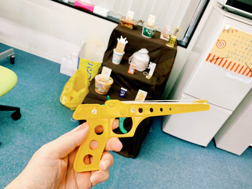 まず最初に射的に挑戦しました。椅子に座った状態でゴム鉄砲に輪ゴムを引っかけて的を狙います。