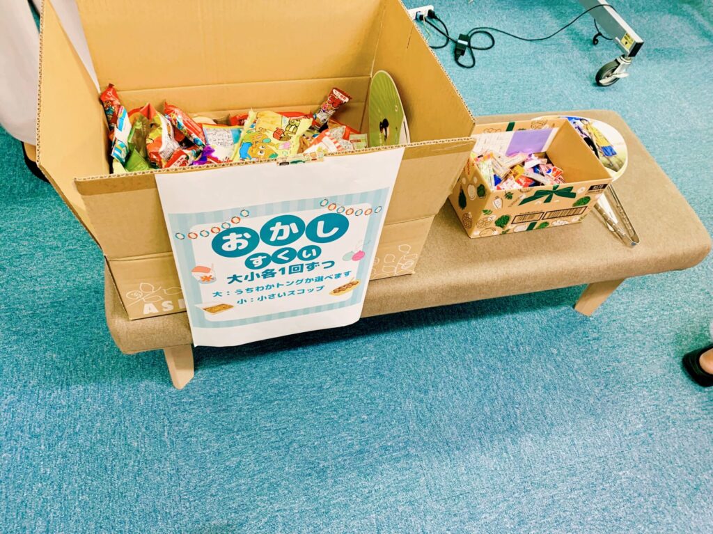 次はおかしすくいです。こちらは大きい箱からはうちわで、小さい箱からはトングでお菓子をすくいます。
