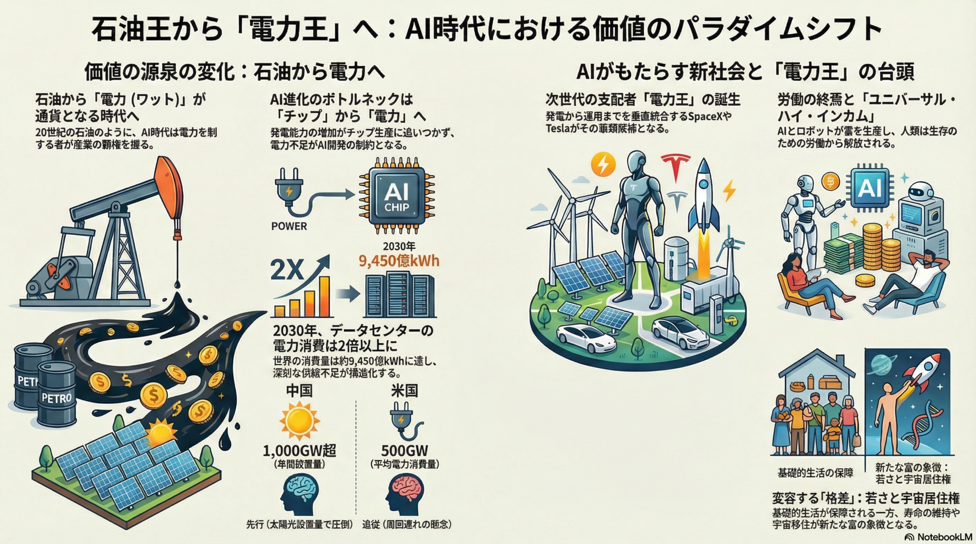 また、注目すべき視点がある。水や食料が希少になる地域では、それらが富の象徴となり得る。しかし地球規模で見たとき、AI時代の価値の中心に置かれるのはやはり電力だ。水と食料はAIとロボットが増産できるが、エネルギーそのものはAIには生み出せない。それが電力を「究極の希少資産」たらしめる本質的な理由だ。
