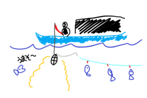 ちなみに友達曰く、この撒き餌とエサのついたヒモの間(イラストの灰色の部分)がテコの原理になっていて、アジがエサを食って引っ張ると自然と針が口に刺さる仕組みになっているそうです