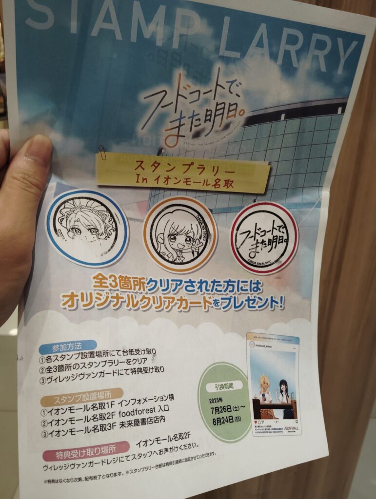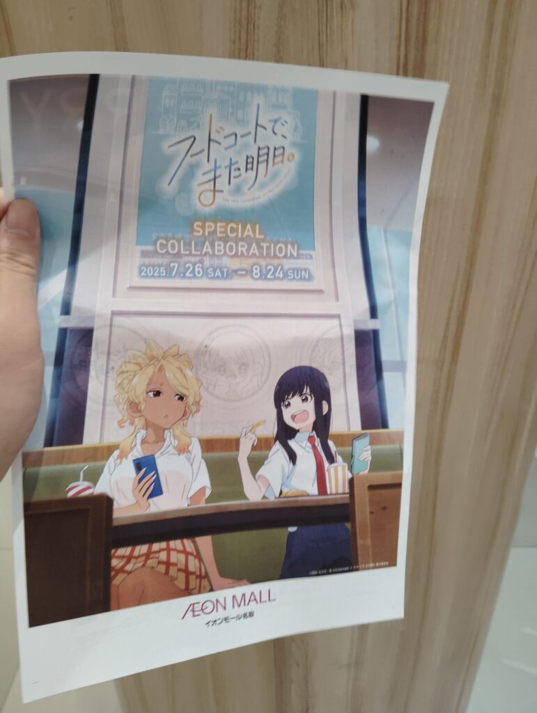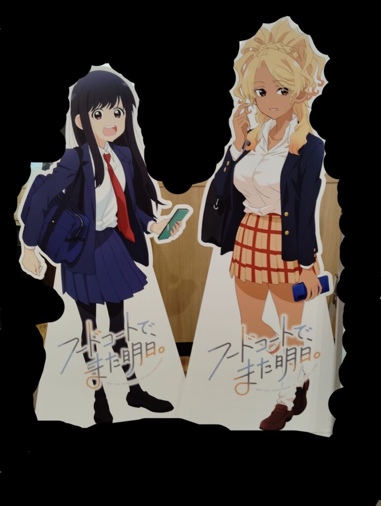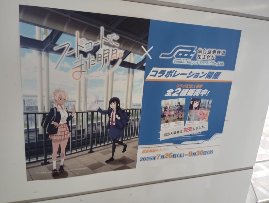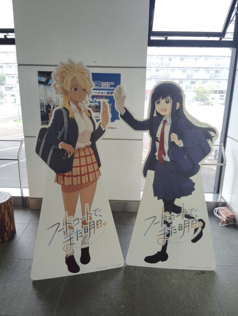 おはこんばんにちは、Red eyes(レットアイズ)です。またイオンモール名取が聖地巡礼化してました。今度はフードコートに仙台空港アクセス線杜せきのした駅とは違うデザインの等身大パネルが設置されてました。杜せきのした駅にある等身大パネル、ポスター、ヴィレッジヴァンガードの原画色紙イラストなどに続いての展示物が登場してました。写真撮ったので載せますね。