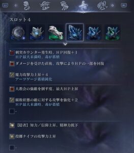 次に”大教会の強敵を倒す度、最大HP上昇”です これはさっきも言った通り隠者はHPが少ないので少しでもHPを盛っておきたいので付けました