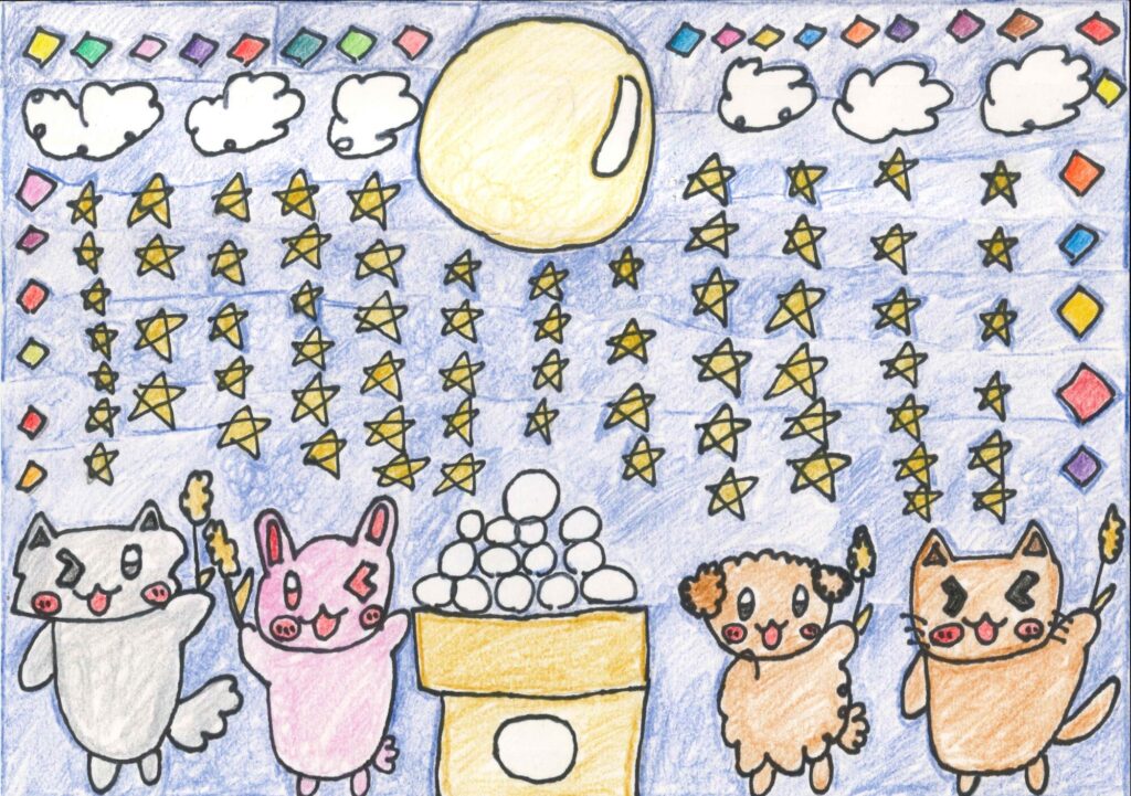 今回は、お月見をしている動物たちを描いてみました!