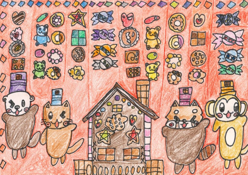 背景にグミ、チョコ、キャンディー、ドーナツ、クッキーを描いておいしそうに見えるように工夫しました。