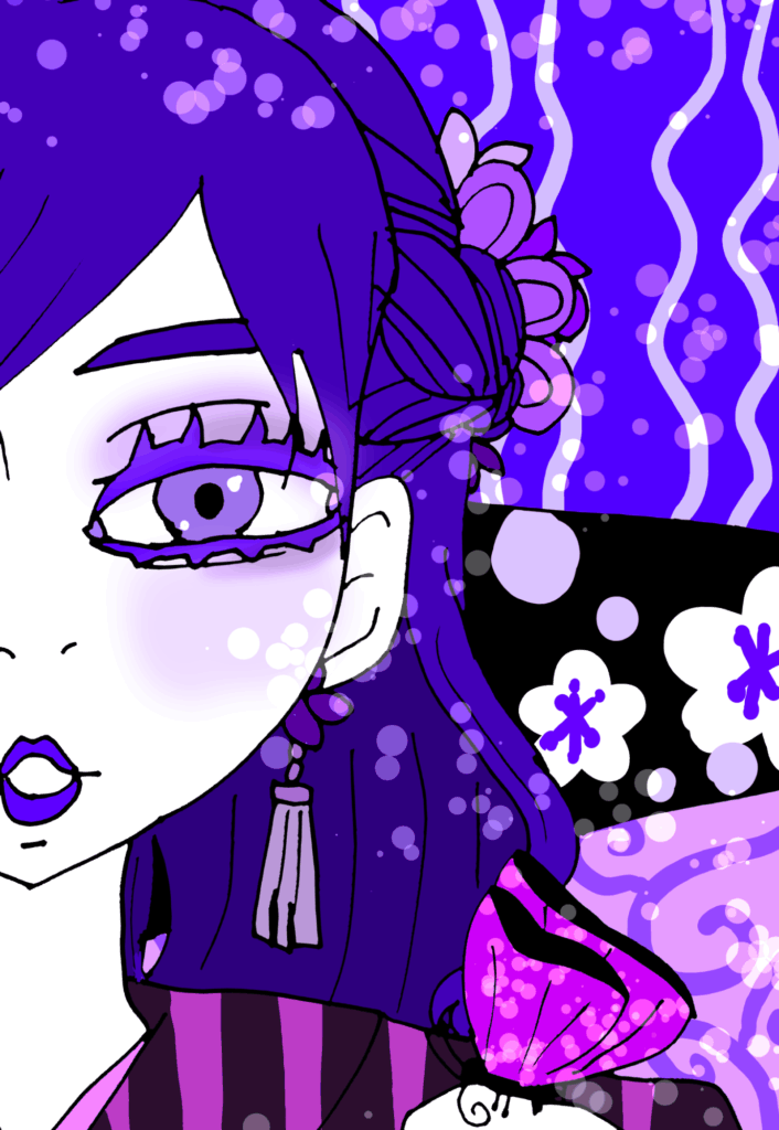 紫系の配色で艶やかな感じに女性や蝶を描いてみました。紫×和風の相性は最高ですね。