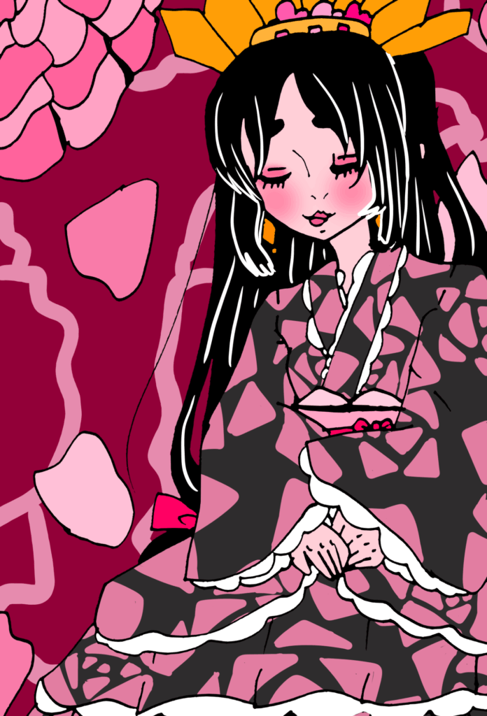 和×洋を組み合わせたような和風なお姫様を描いてみました。薔薇柄の着物ドレスが綺麗ですね。
