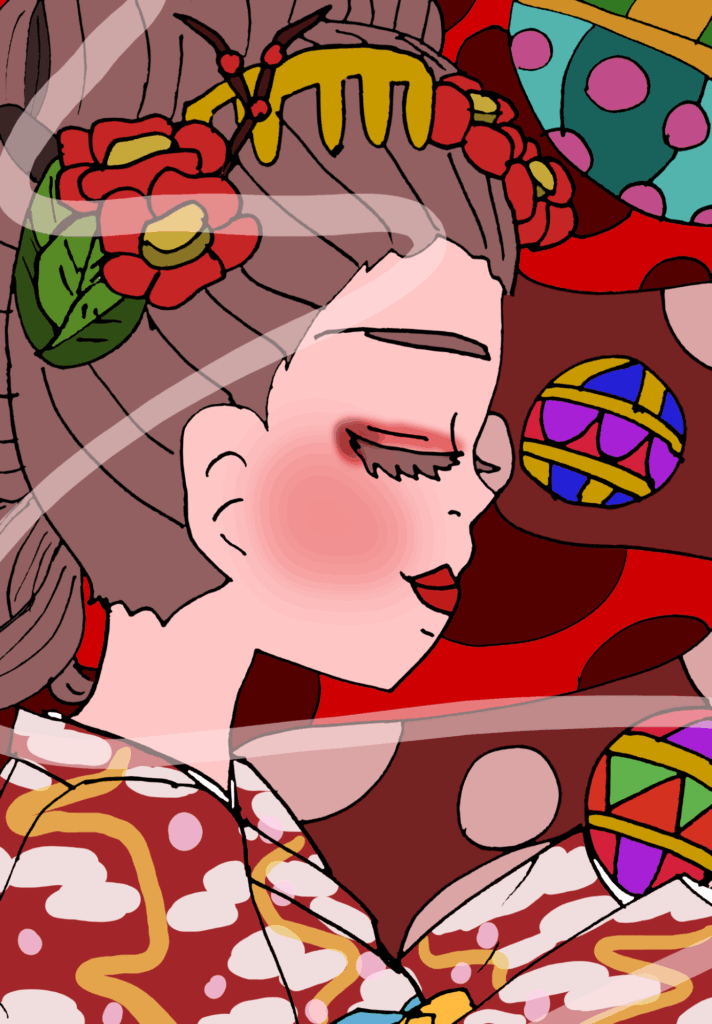 手に手毬を持っている花魁を描いてみました。赤い着物がカッコいいです。