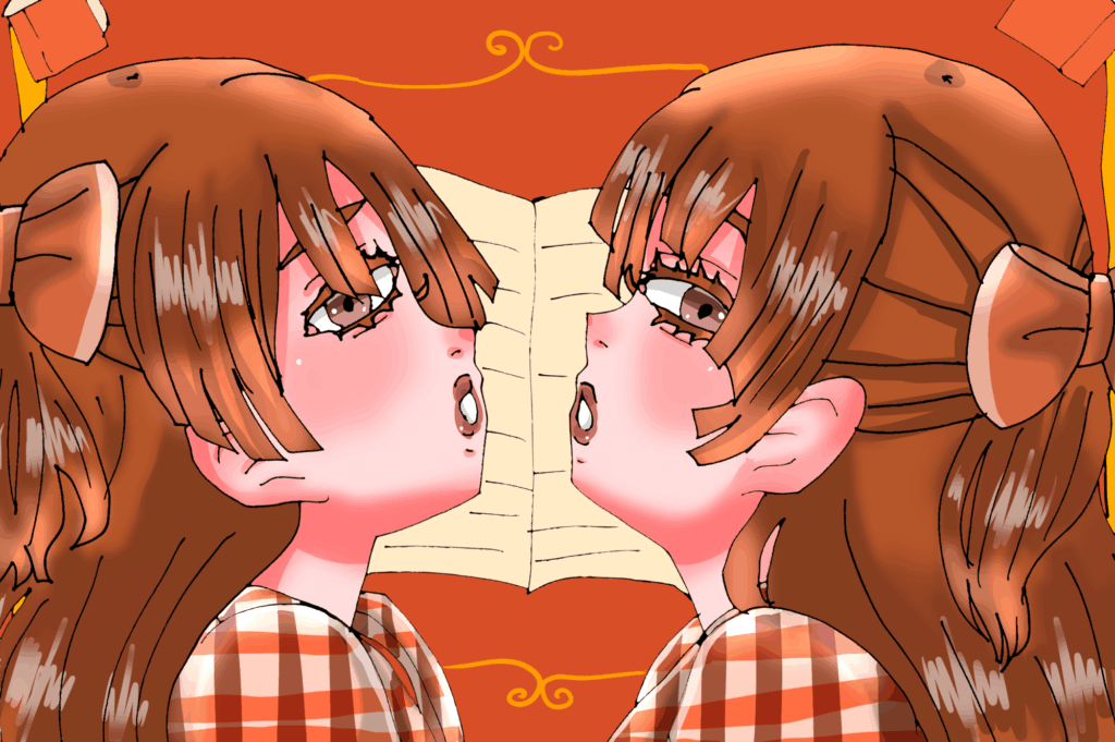 オレンジ系の色でハイカラでオシャレな双子の女性を描いてみました。お揃いの服とリボンも可愛いです。