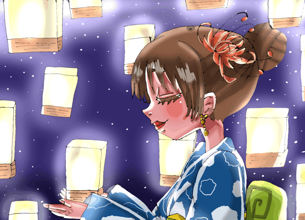 何かを思いながらランタンを手に乗せている女性を描いてみました。ランタンの光って、芸術的で綺麗ですよね。