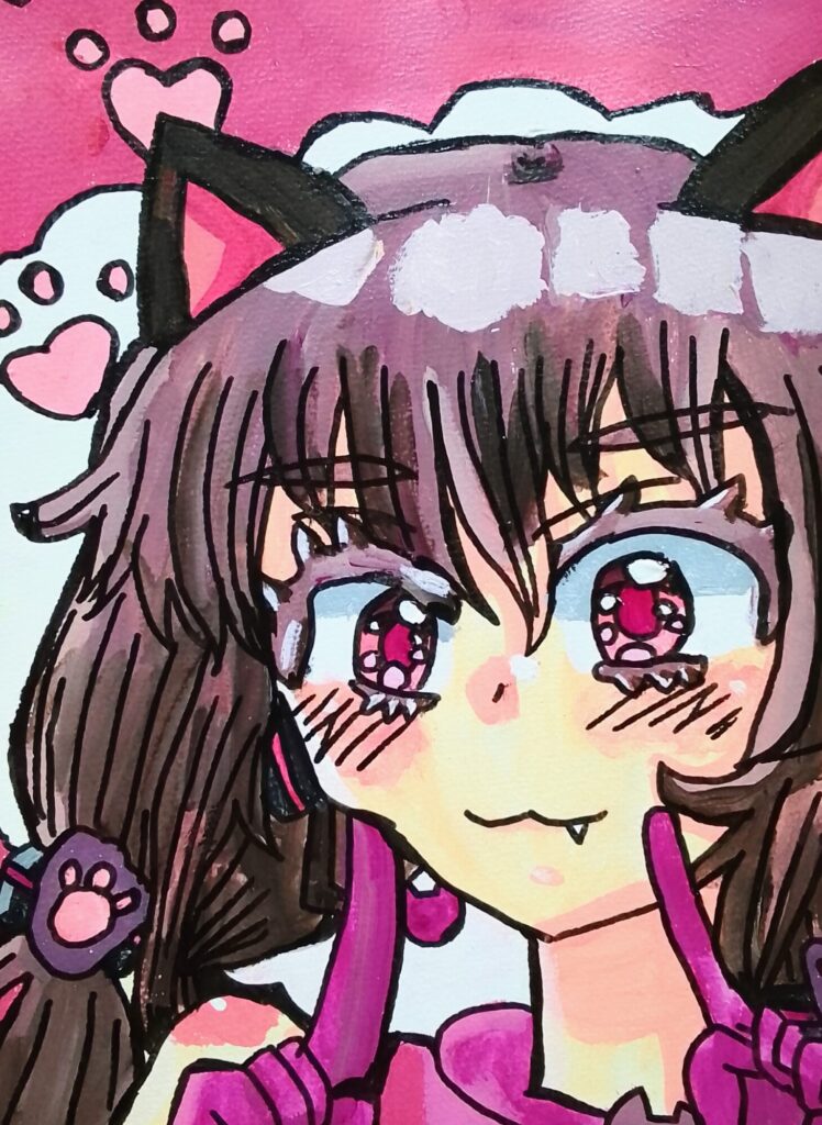 ヘッドフォンを付けている猫耳の女の子が指で頬を押してスマイルしている様子を描いてみました!八重歯が可愛い・・・♡