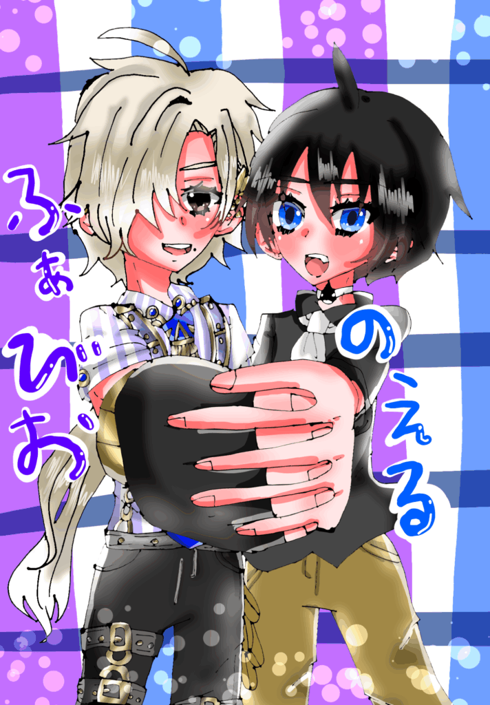 最後のイラストは、私のオリジナル小説の「愛しのアクアリウム」のオリキャラのノエル君と名前さんのオリジナルアーティストキャラシリーズのファビオ君のコラボイラストにしてみました!名前さんのキャラのファビオ君の設定がとてもカッコ可愛いかったです!ギター担当で、お菓子作りが得意で長身なところにキュンときました。